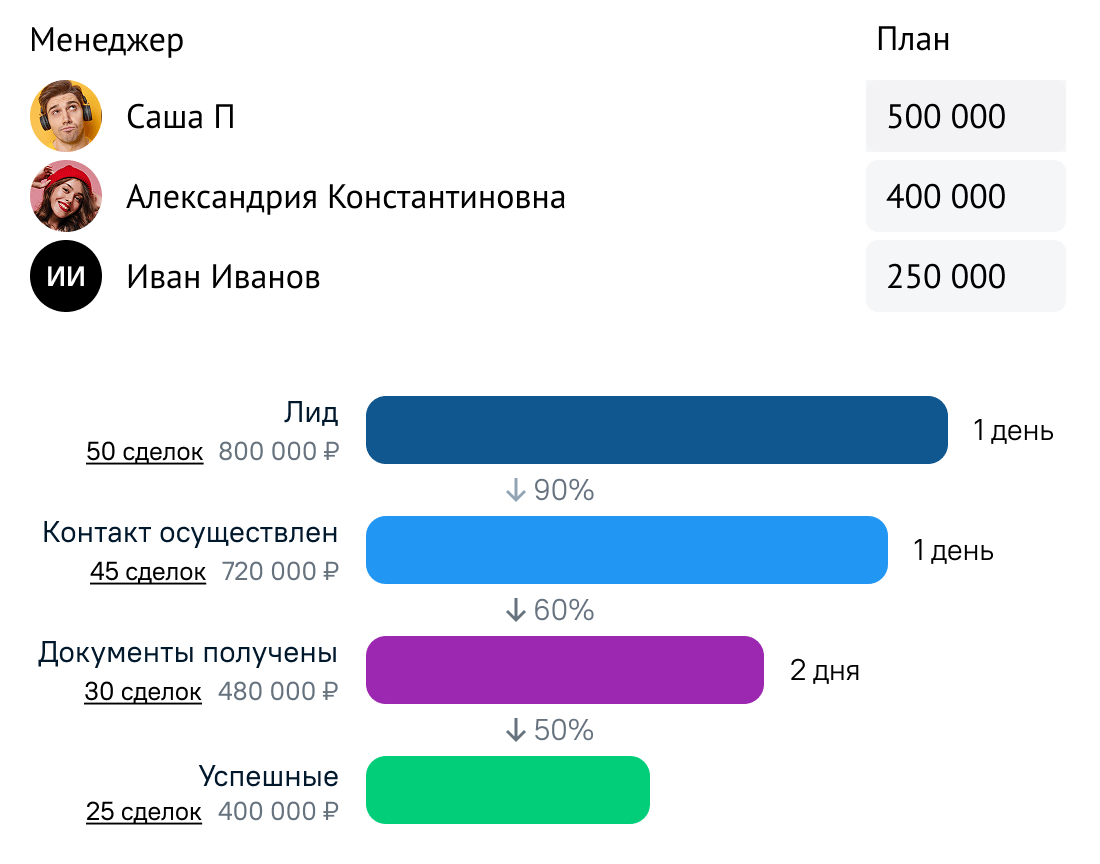 Следите за эффективностью воронки продаж и выполнением плана по отделам и каждому из